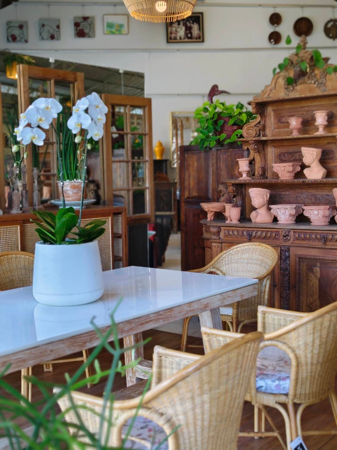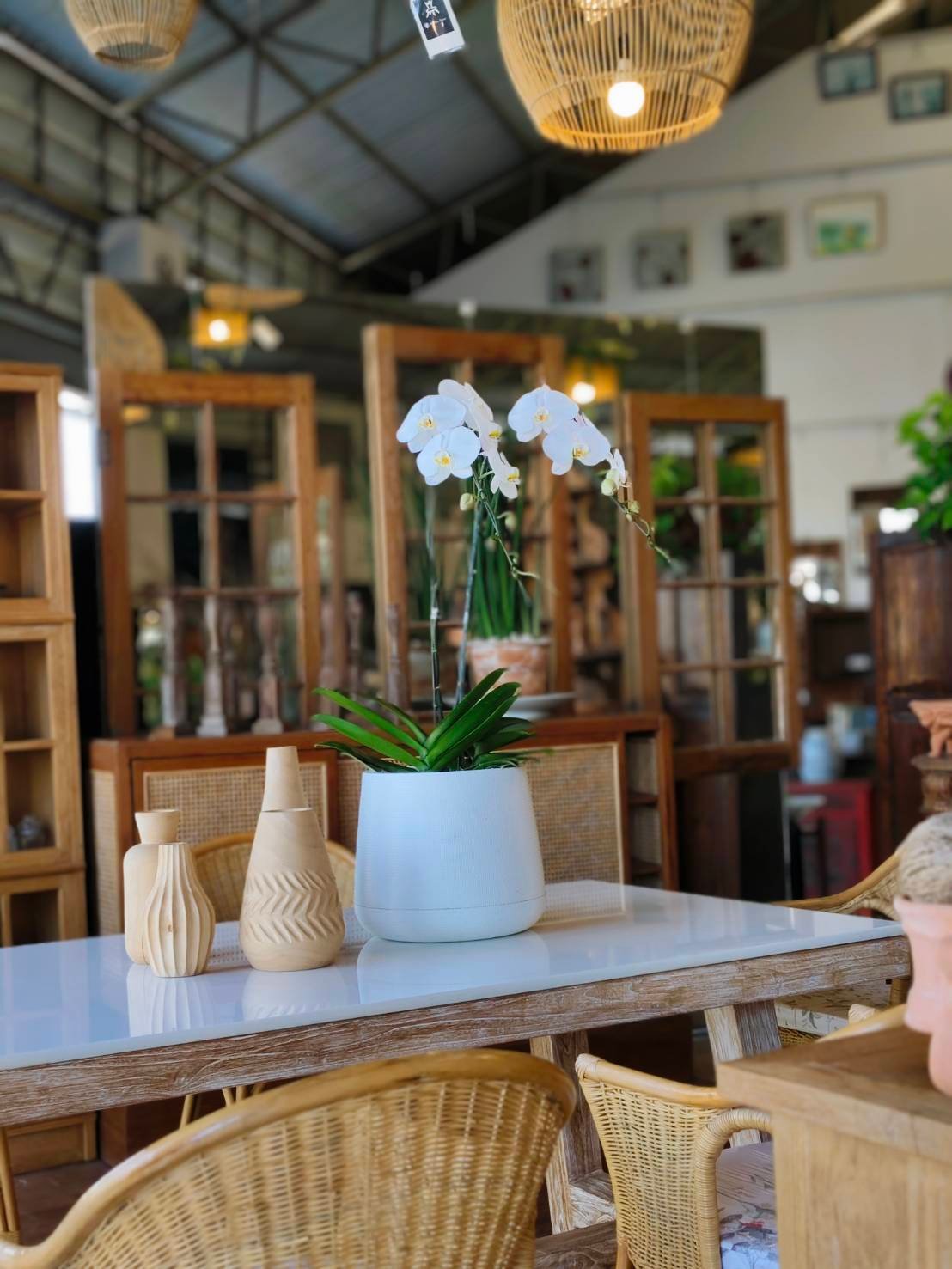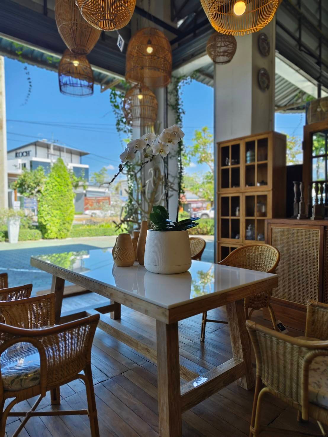 ชุดโต๊ะอาหารไม้สัก ขาตัว A Top ด้วยหินแกรนิต + เก้าอี้หวายน้ำผึ้ง